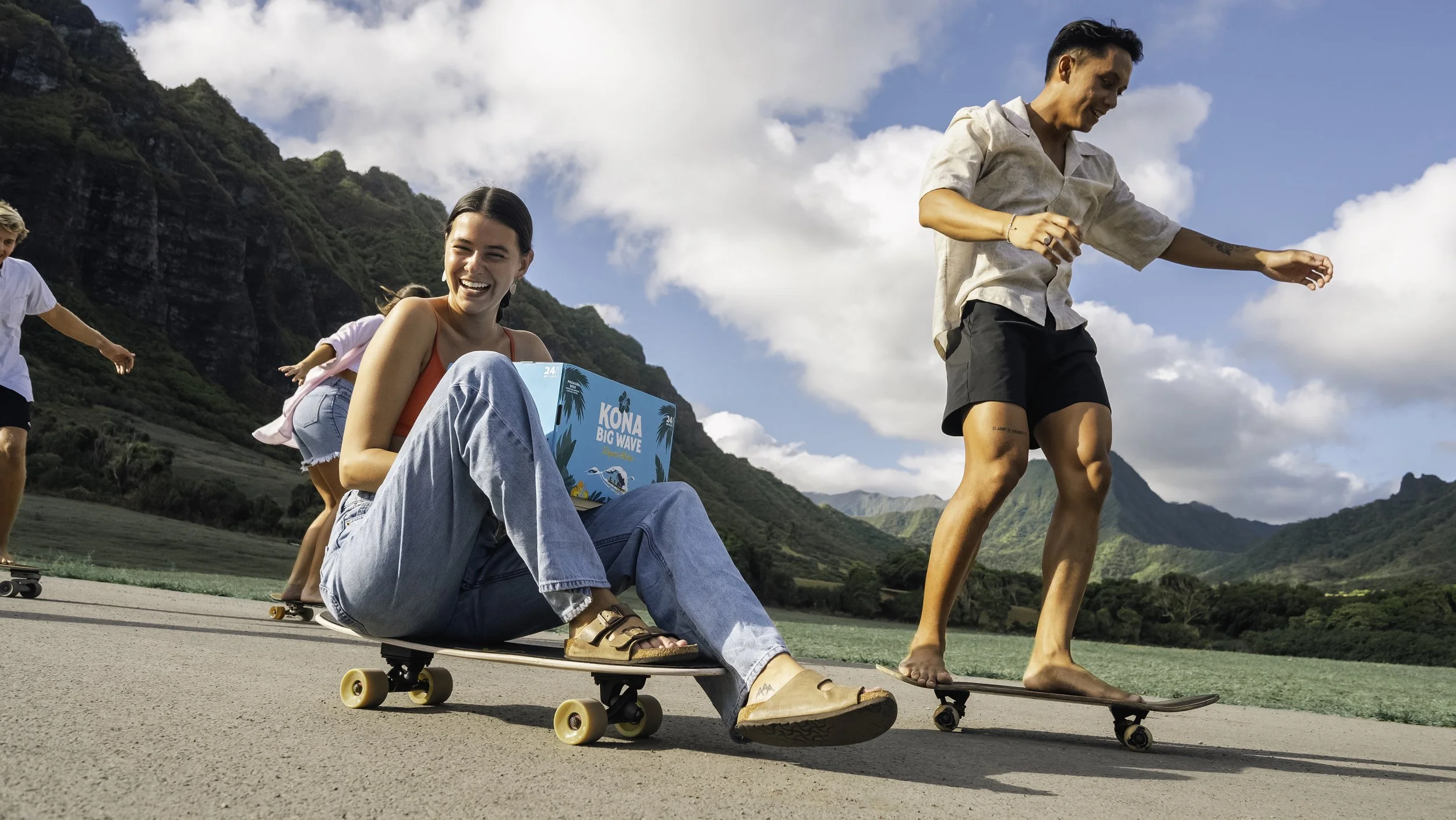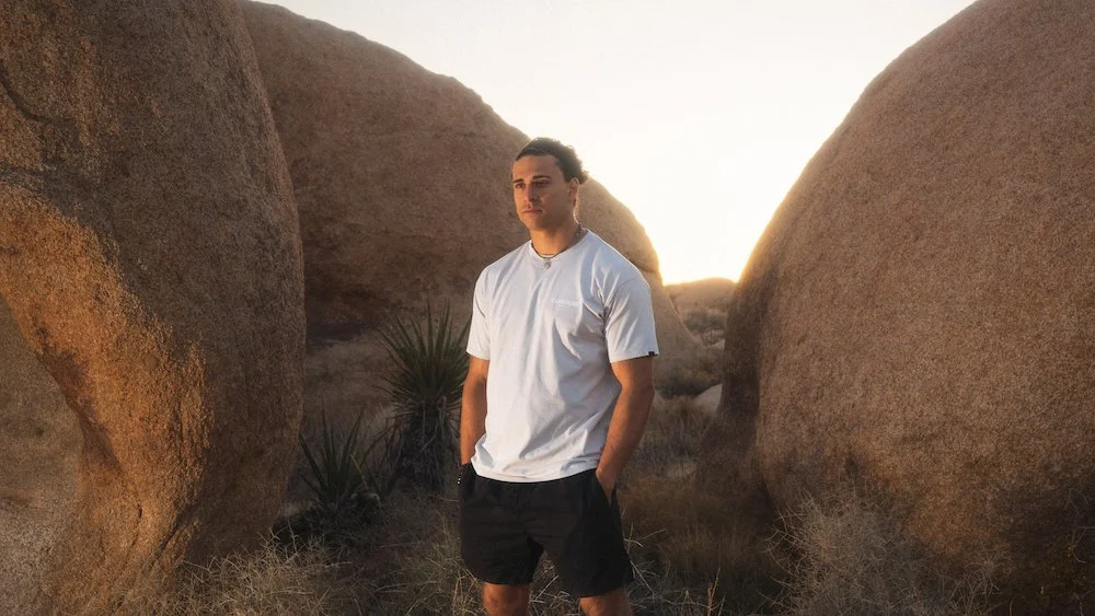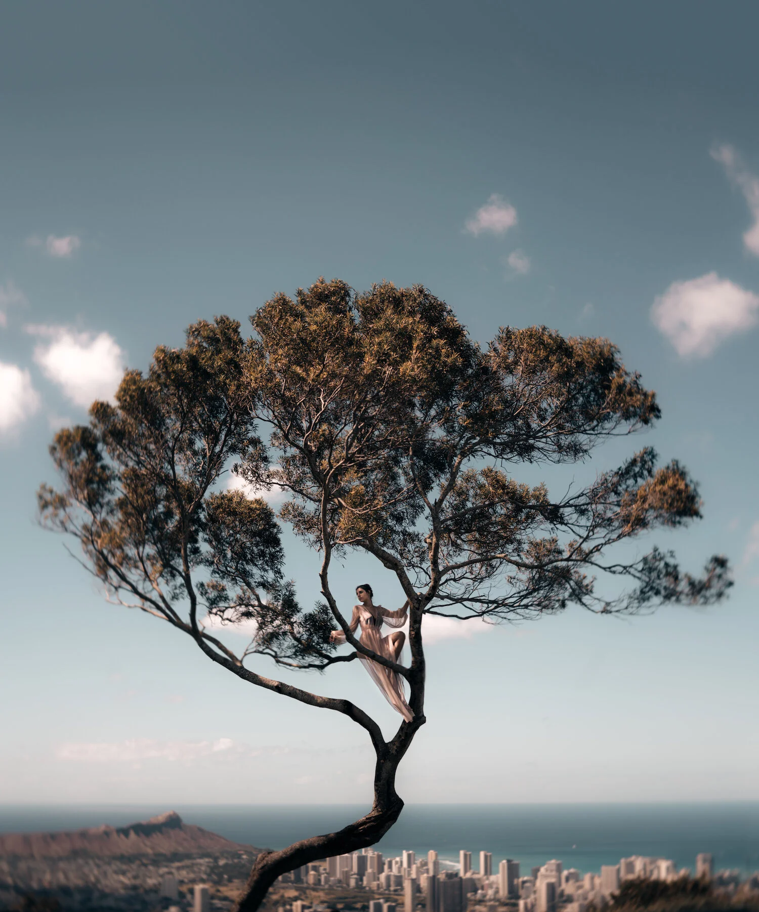 free fall, girl, active wear, hanging off a cliff, blue active wear, athletic, rock, editorial photography