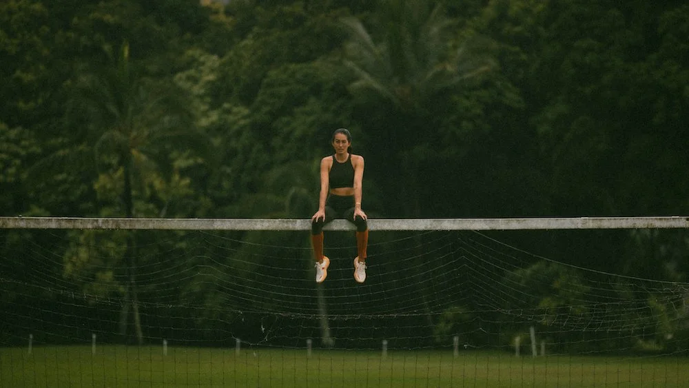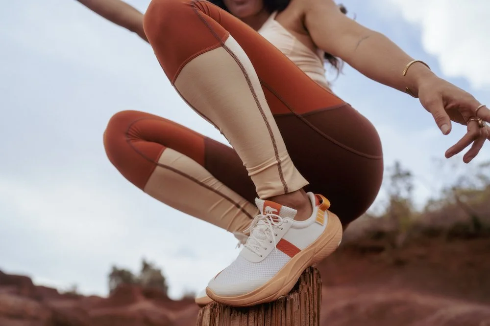 active wear, active wear set, red set, running, hiking, outdoors, athletic, stretch, girl, athletic girl, forest, editorial photography