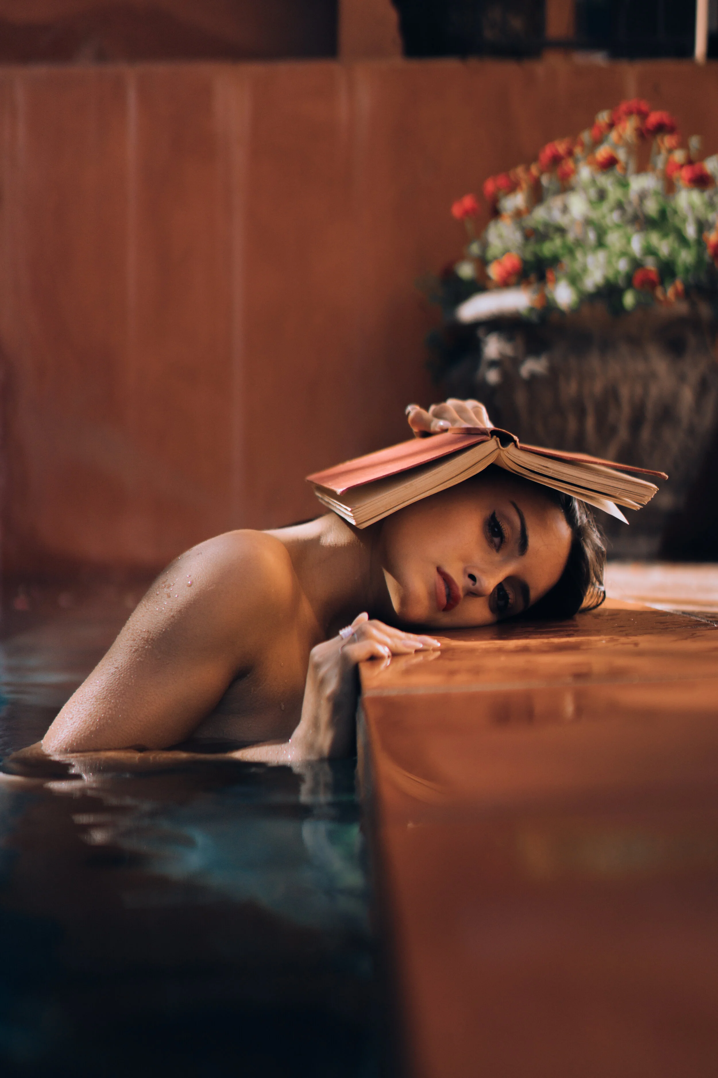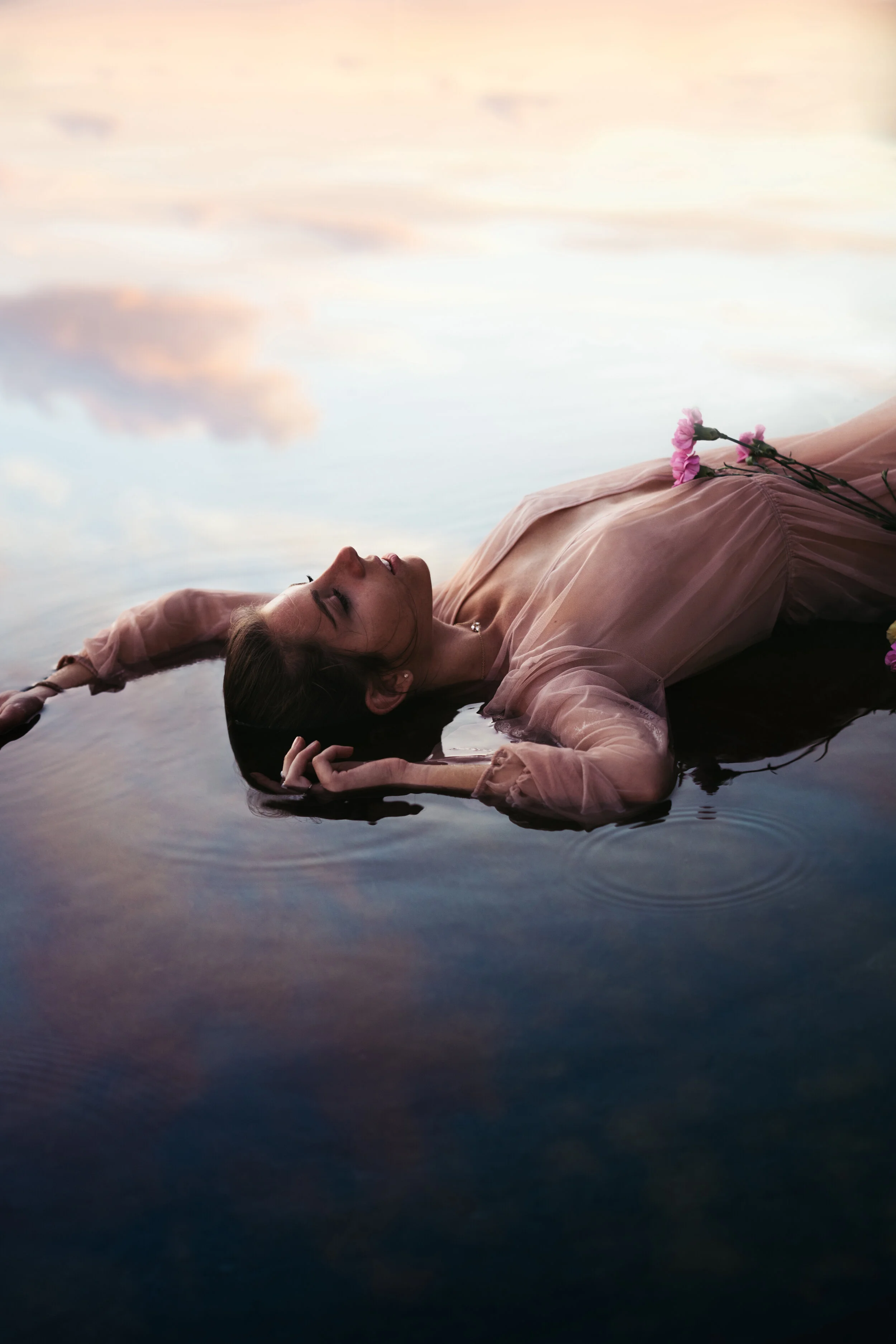 ocean, women, flowers, reflection, editorial photography, pink dress, wet