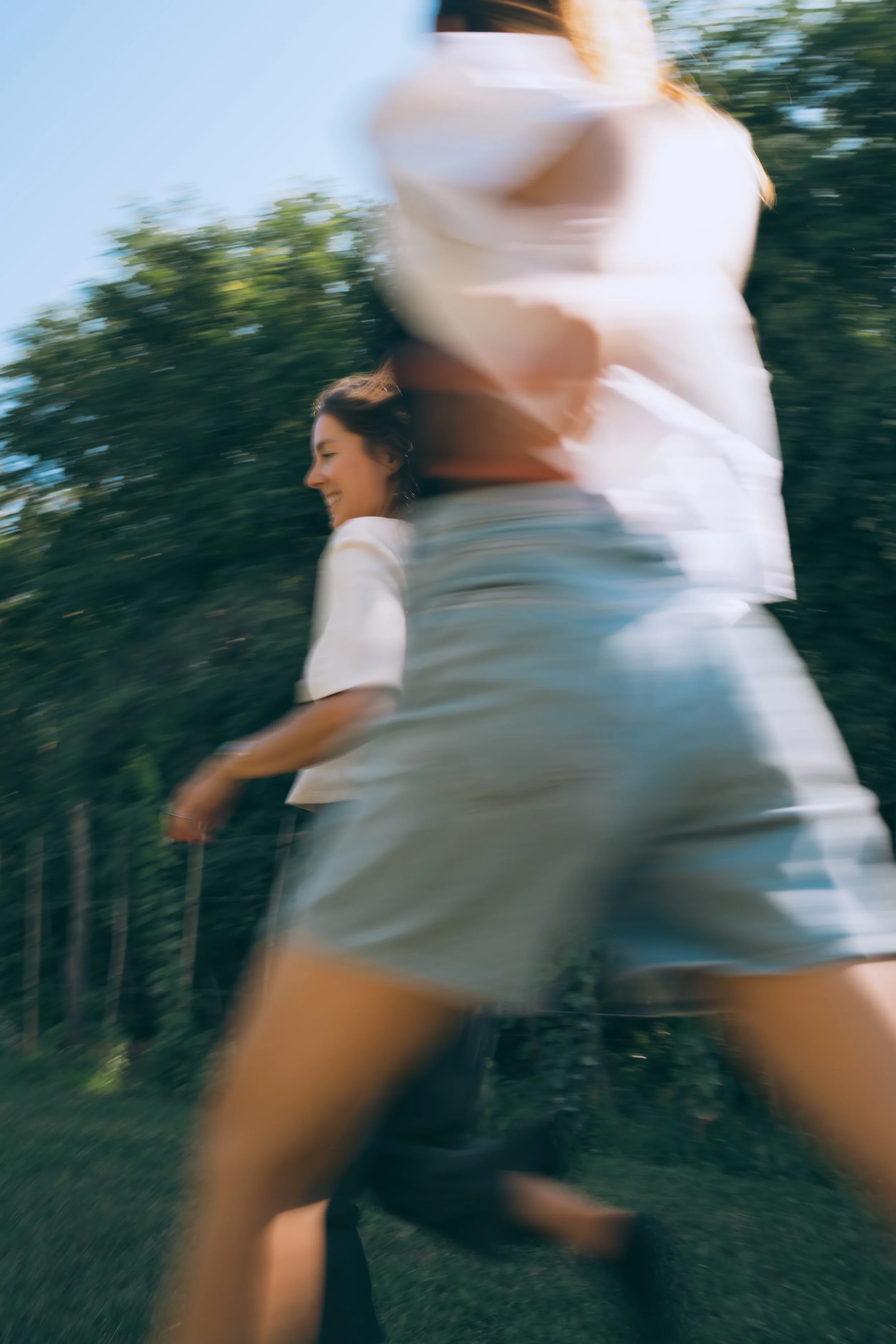 Editorial Photography. View from bellow. Women swimming, Lake, Ocean, Blue Sky